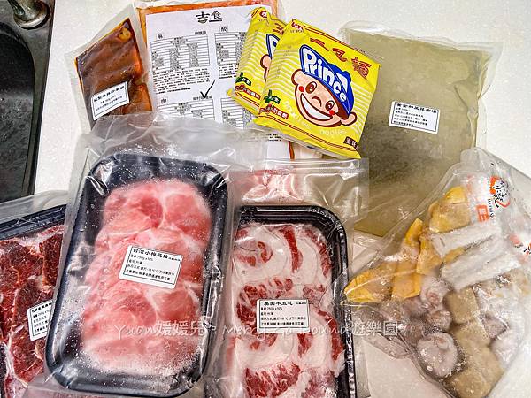 1️⃣台灣優質豬200g 2️⃣頂級巴拉圭板腱牛200g 3️⃣美國頂級五花牛200g 4️⃣法式櫻桃鴨200g 5️⃣台灣雞腿柳條200g 綜合火鍋料350g 王子麵2包 (可換蒸煮麵)